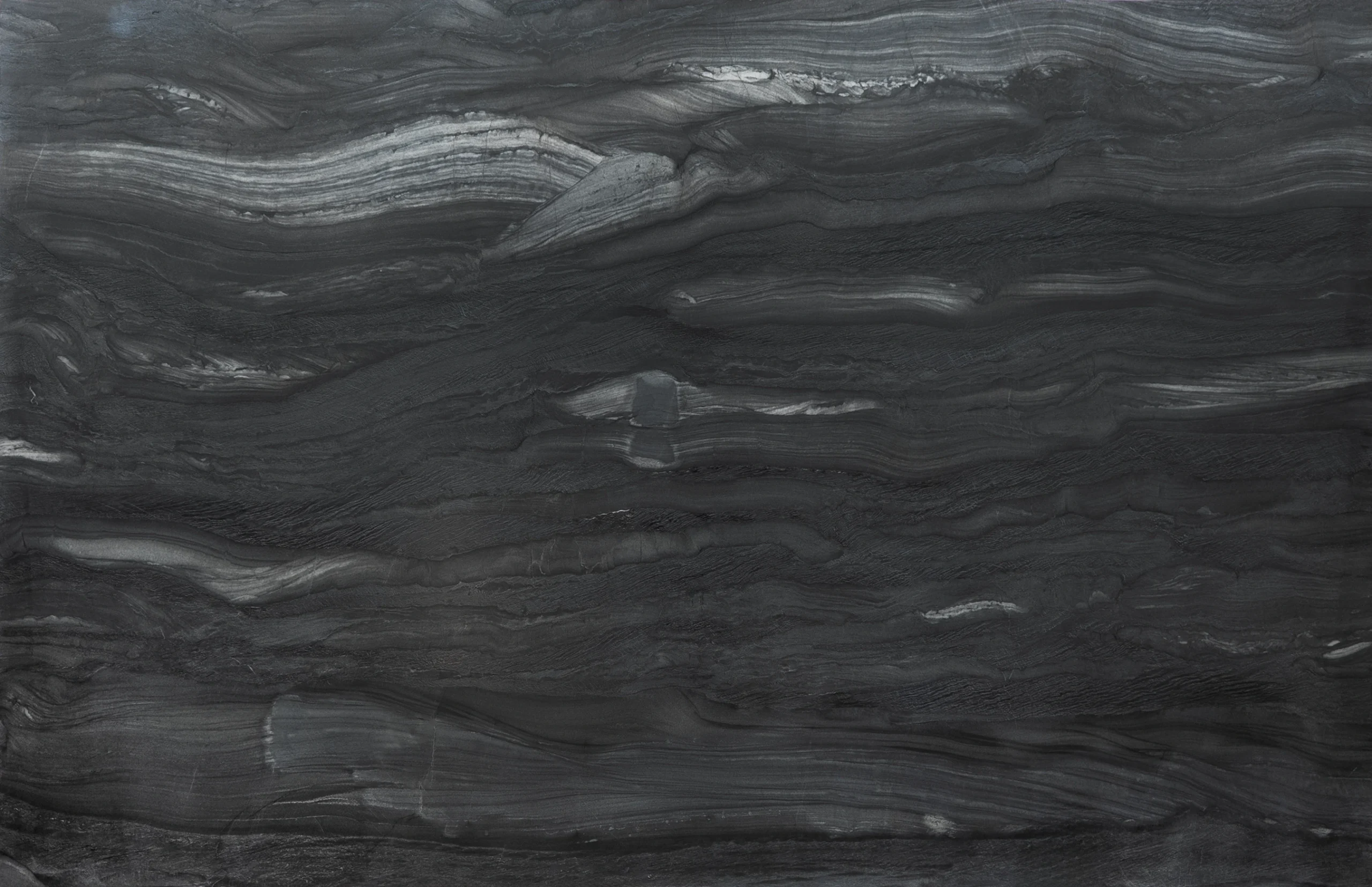 This quartzite features a deep charcoal base with layered gray movement and soft silver highlights, finished in a leathered texture that enhances depth and adds a rich, tactile feel, ideal for bold statement countertops and modern, high-impact spaces.