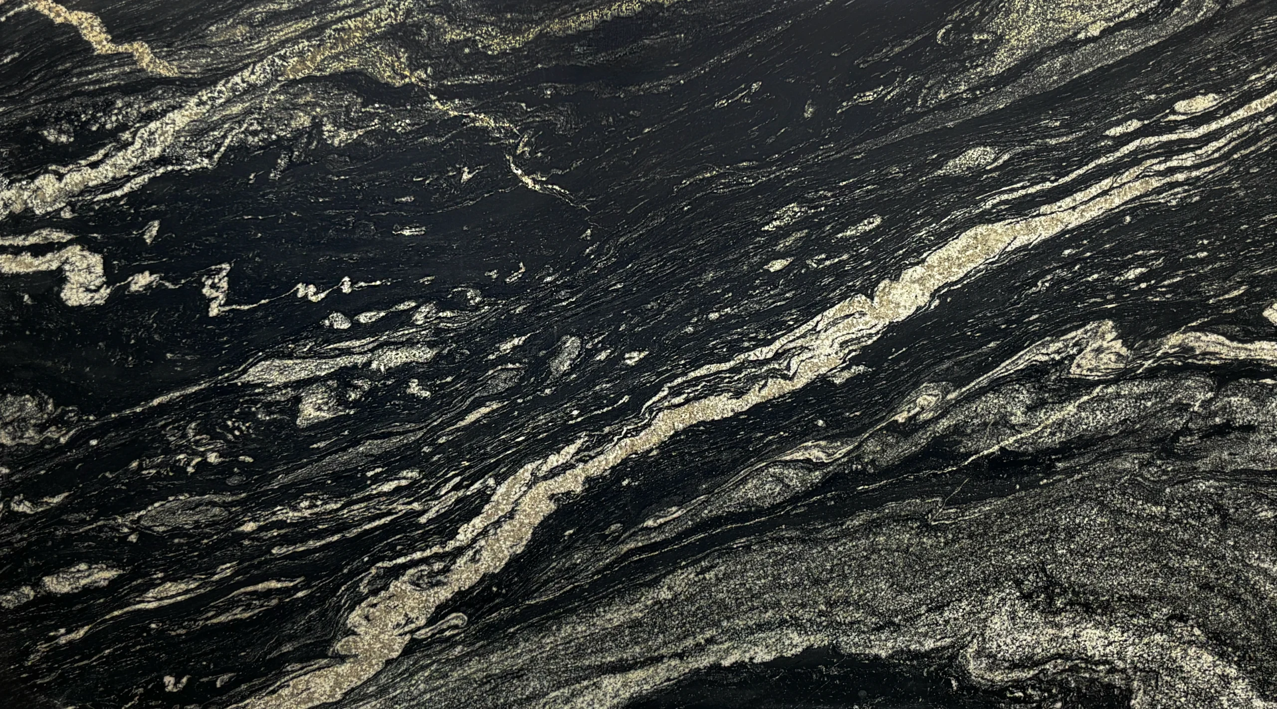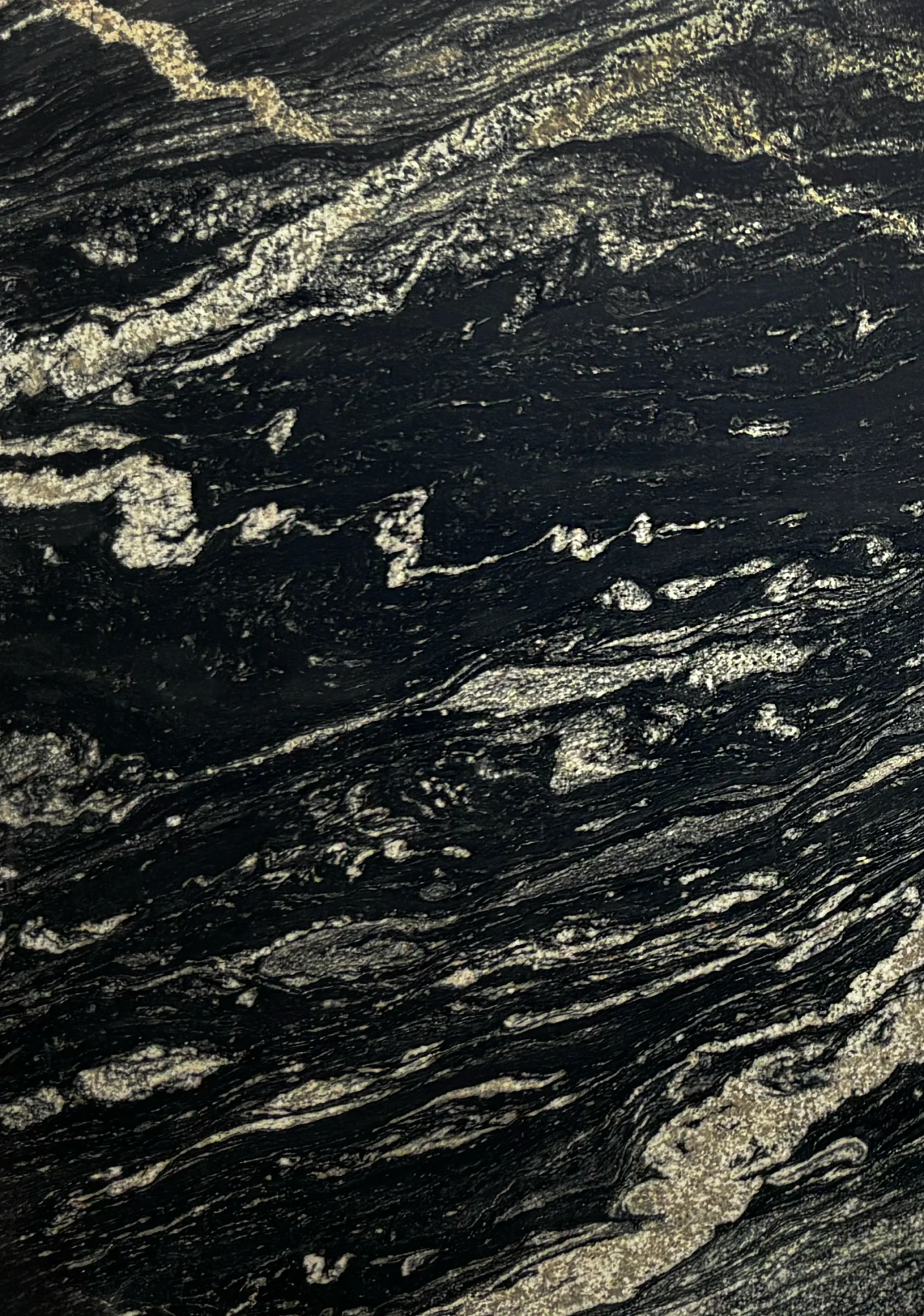 This granite features a deep black background with flowing cream and soft white veining, creating a refined and high-contrast look for kitchen countertops. Black Storm Cover granite is a popular natural stone choice in Phoenix for adding depth and movement to kitchens, islands, and feature walls.