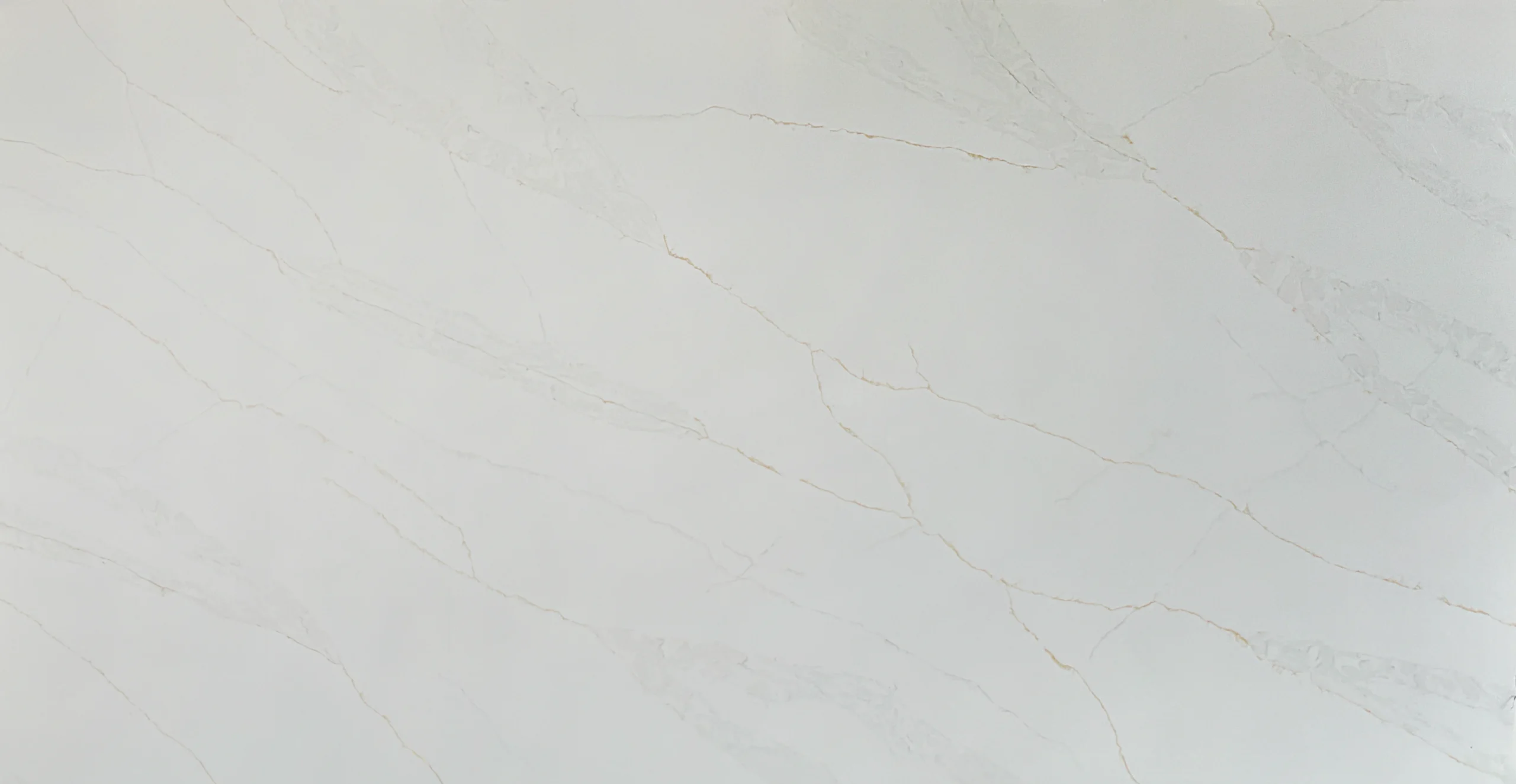 This quartz features a soft white background accented by delicate gold veining that flows naturally across the surface. Its subtle movement adds warmth and elegance, making it a perfect choice for bright kitchens, refined bathrooms, and timeless interior designs.