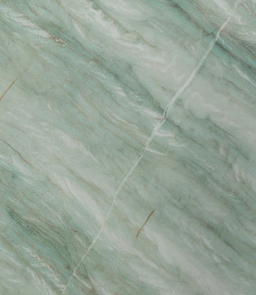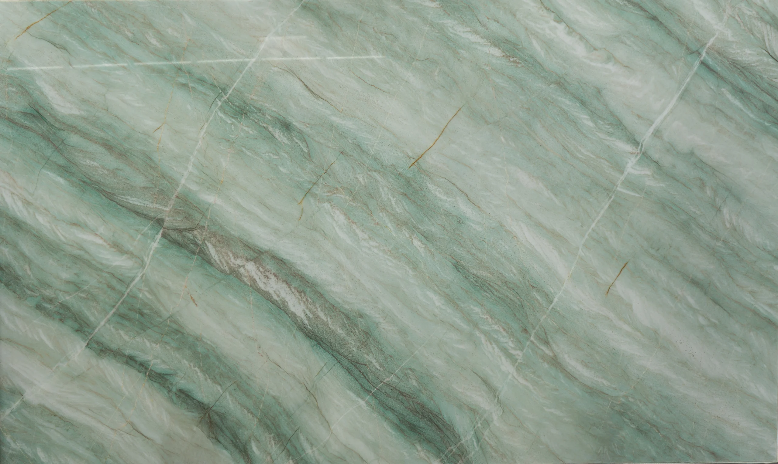This quartzite features stunning waves of soft green, white, and gray accented by delicate gold veining, creating a refreshing and luxurious natural look.