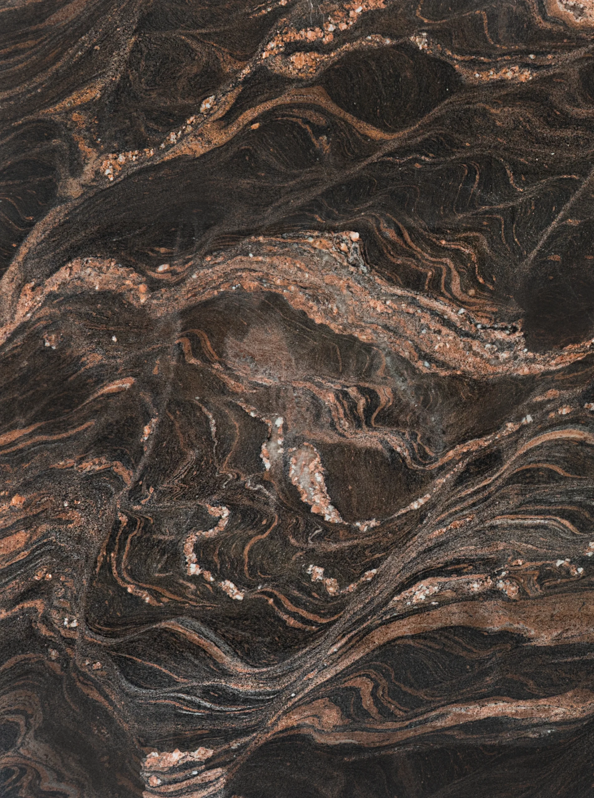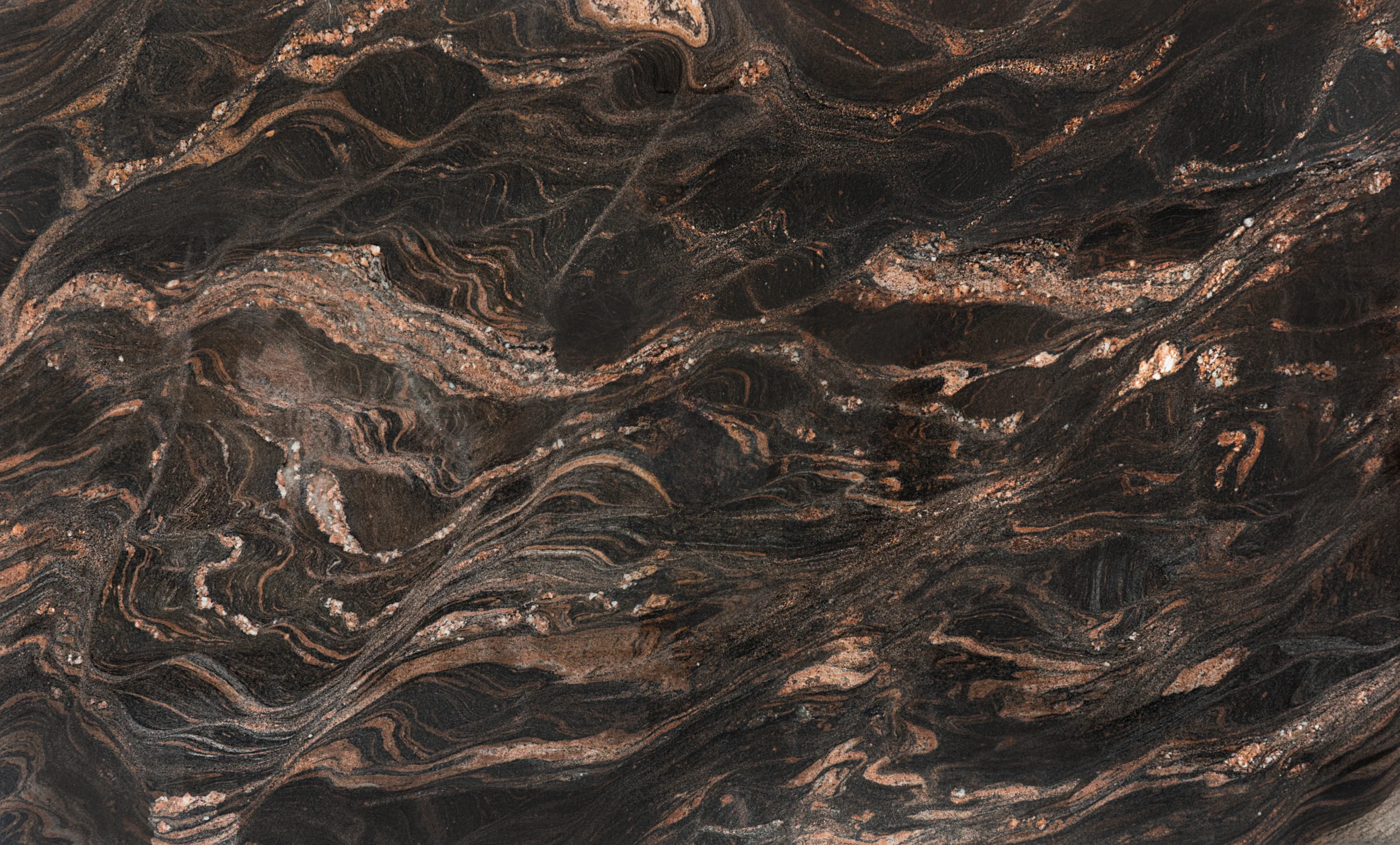 A bold black granite with elegant brown and gold orange veining, offering rich movement and a luxurious, exotic look.