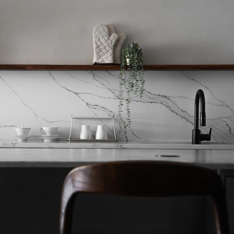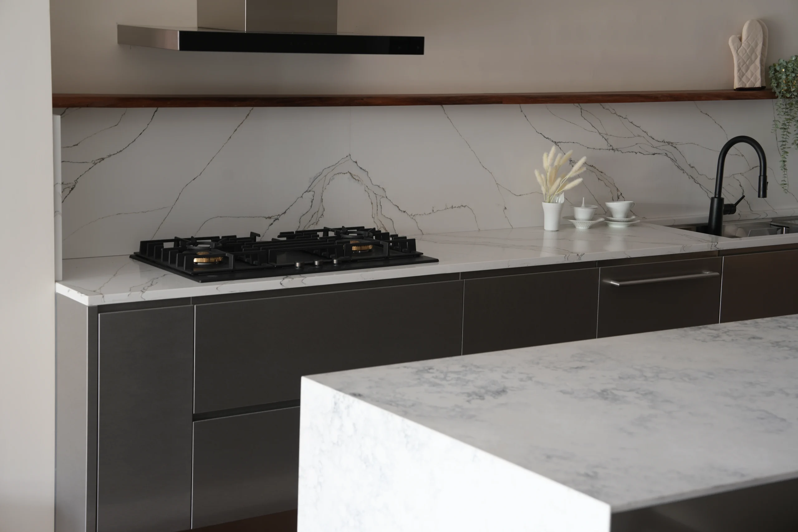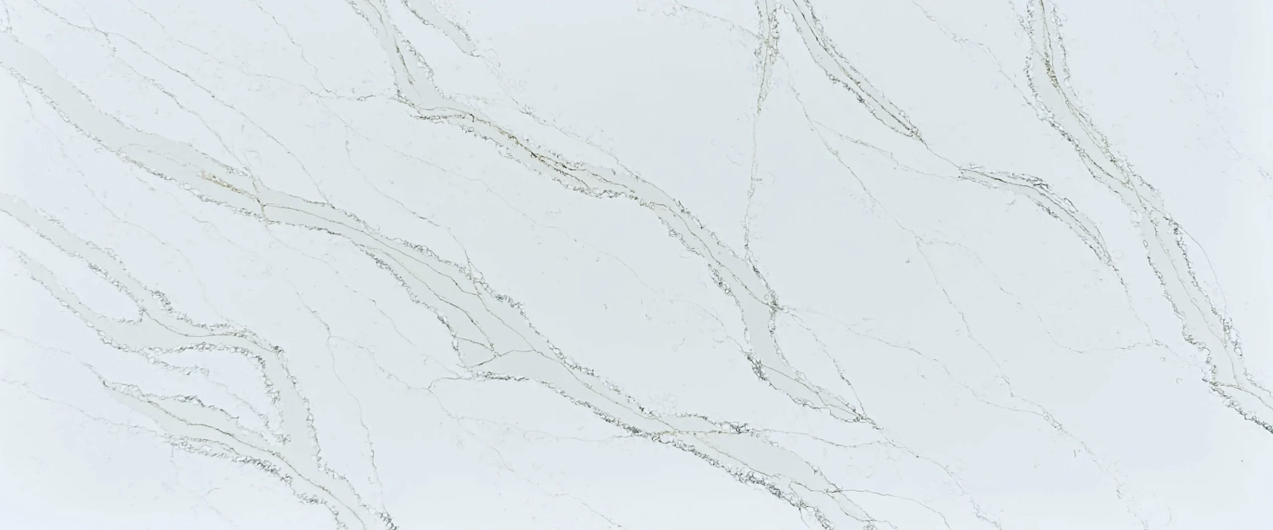 A bright white quartz with soft gray and gold veining, offering a timeless, elegant look perfect for kitchens, bathrooms, and modern interiors.