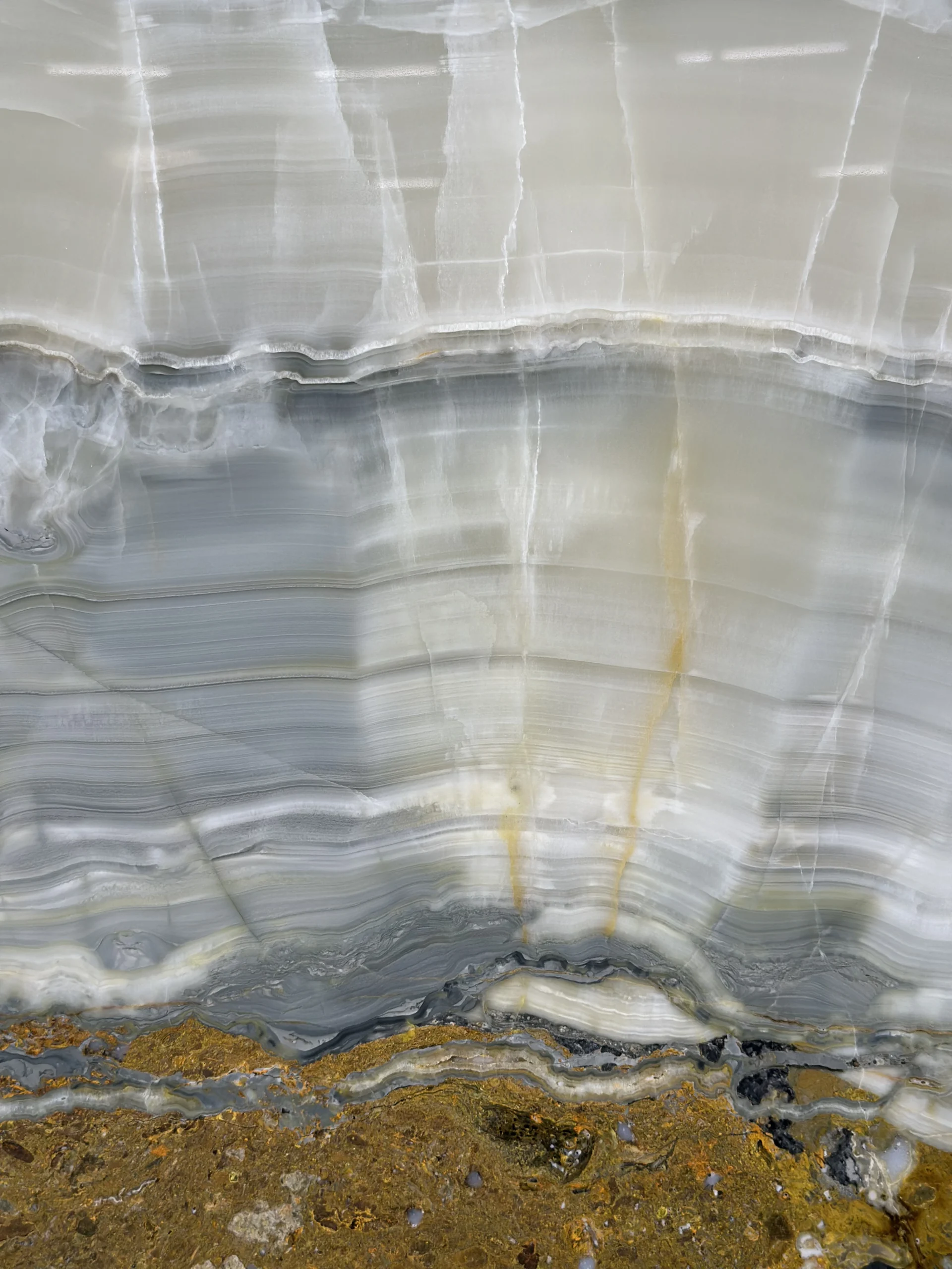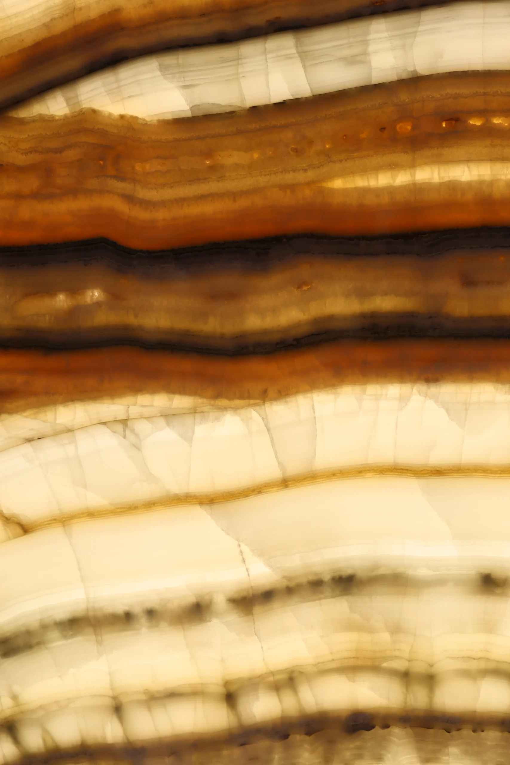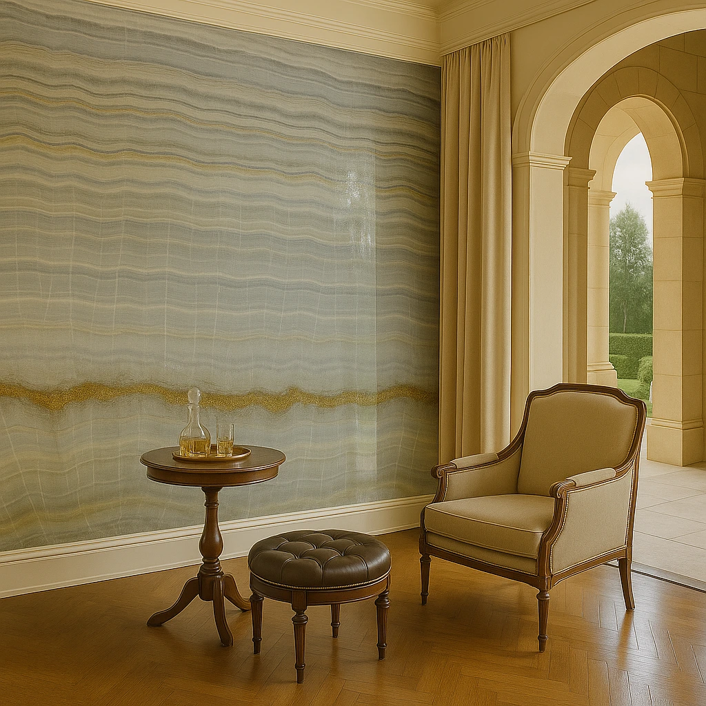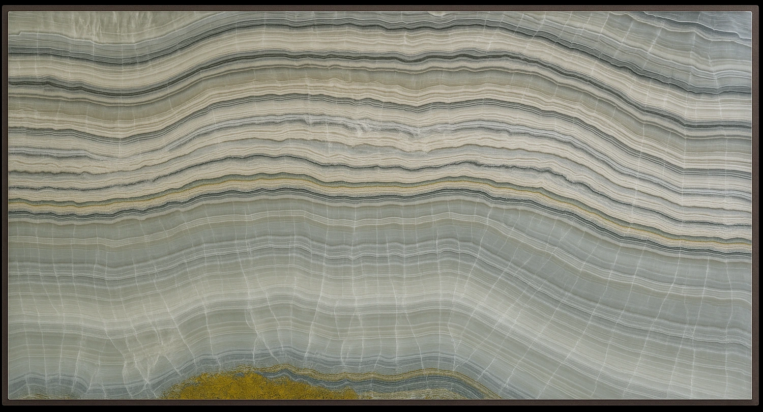 This onyx features flowing waves of green, grey, and ivory with natural translucency that glows beautifully when backlit — a bold and luxurious choice for feature walls, countertops, and statement designs.
