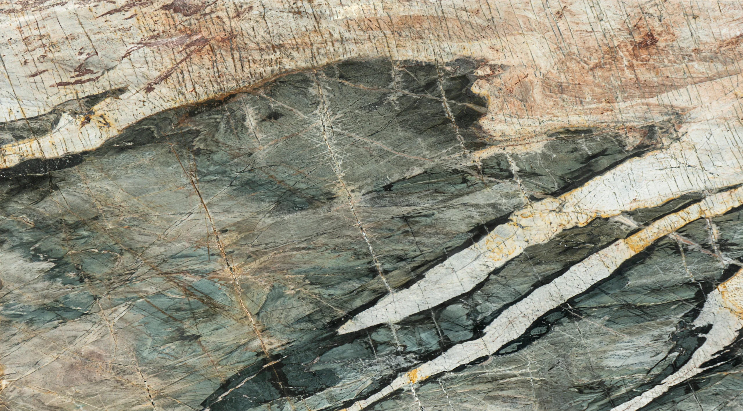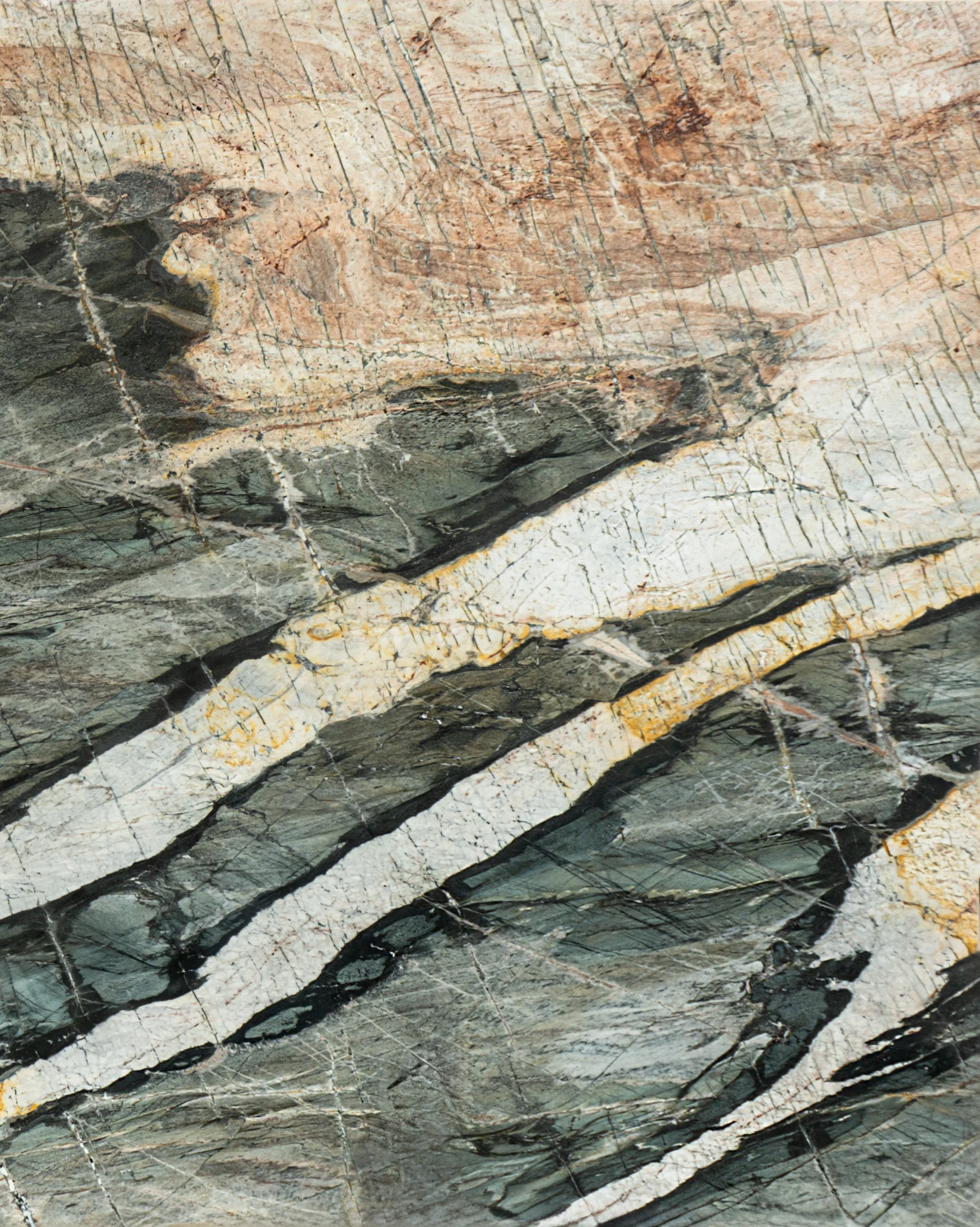 A striking exotic stone featuring layered green, gray, and white tones with bold black and gold veining, offering dramatic movement and a truly unique natural look.