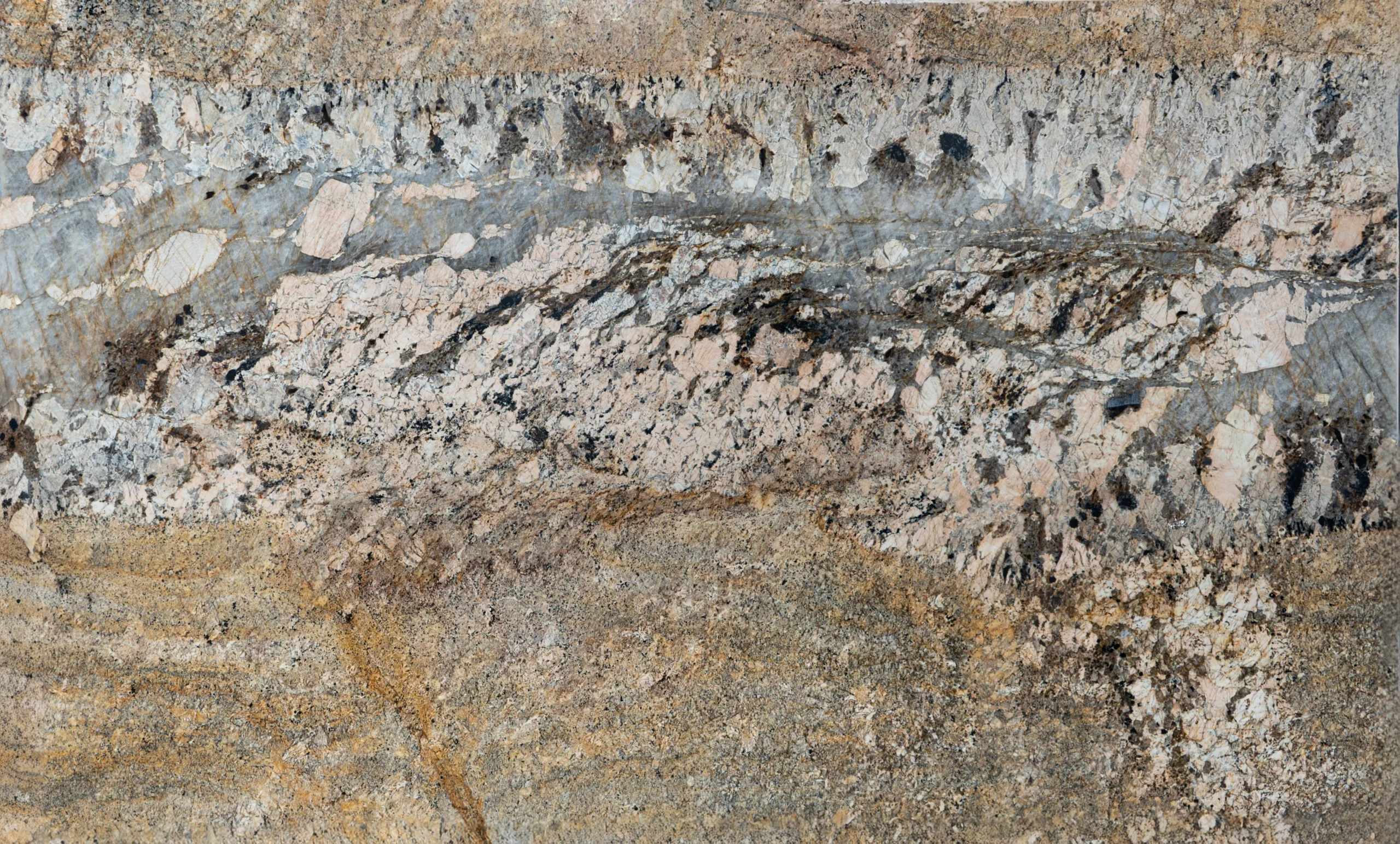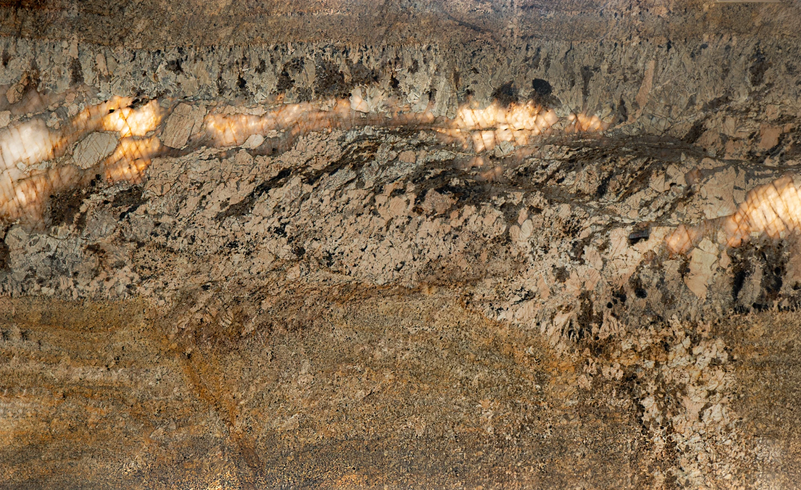 This granite features warm gold, brown, and cream tones with dramatic mineral patterns and naturally translucent sections that glow beautifully under backlighting.