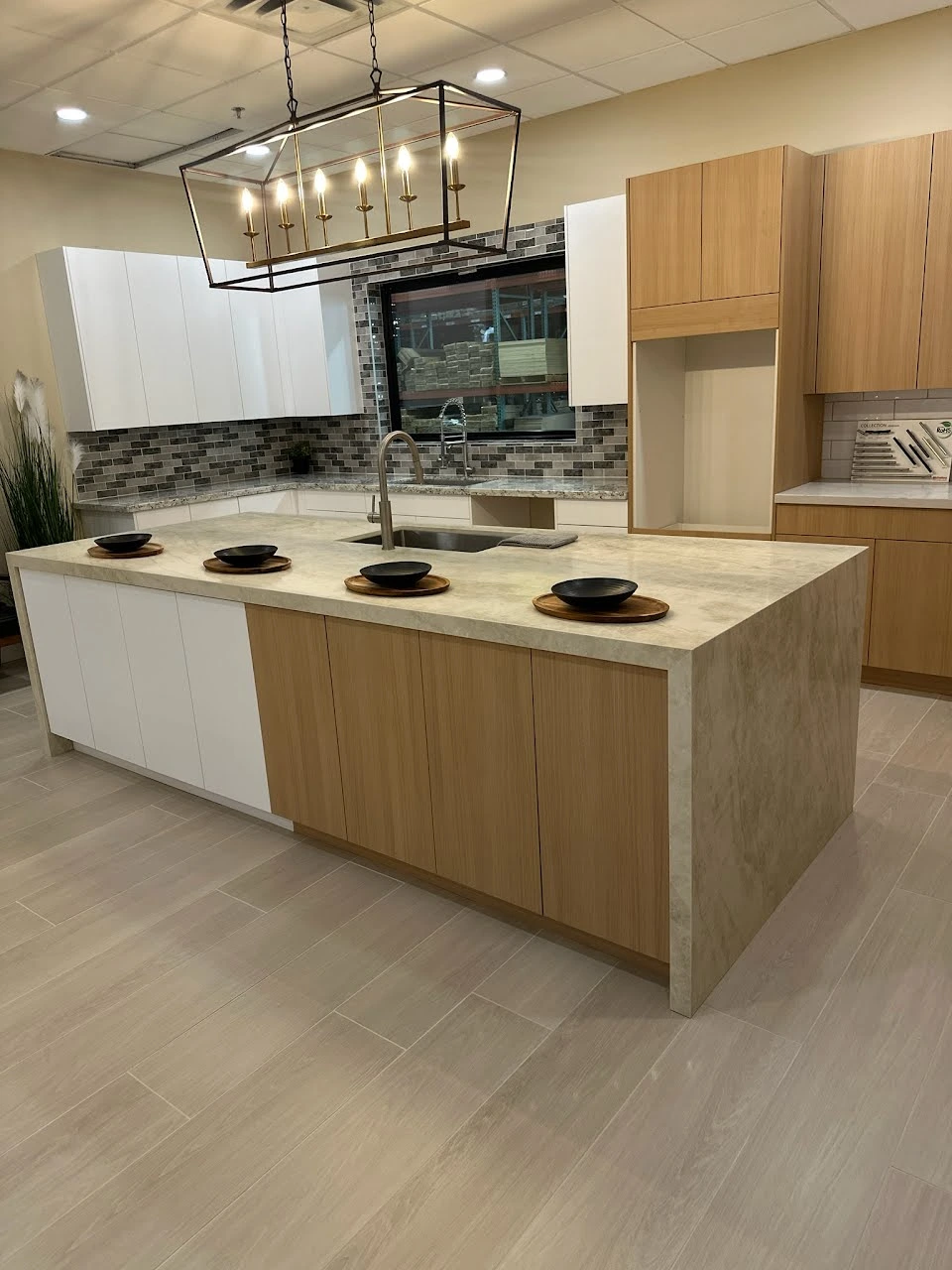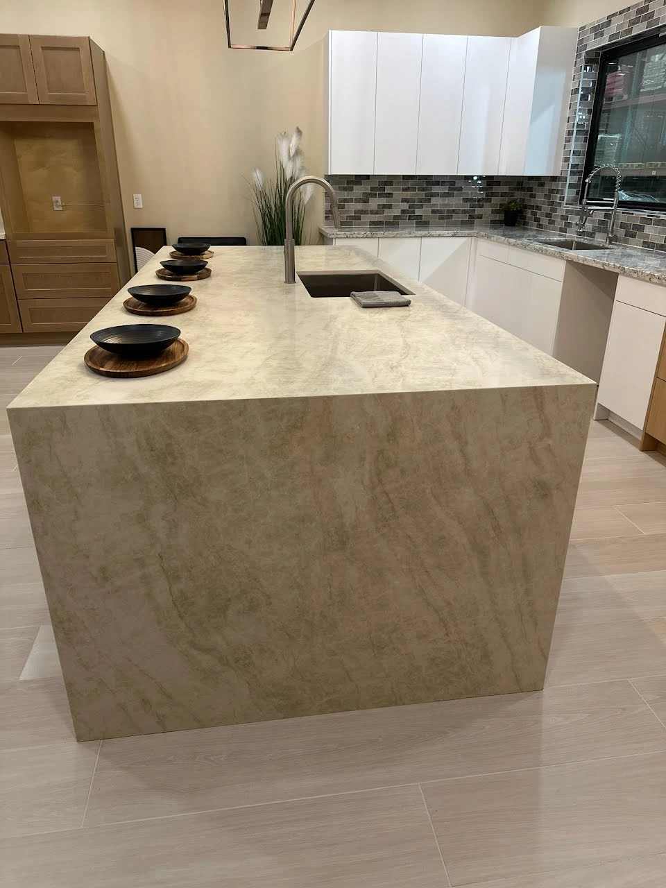 “This quartz features a warm white to light beige base with soft, flowing light gray and cream patterns, creating a warm and elegant surface with a gentle, natural feel.”