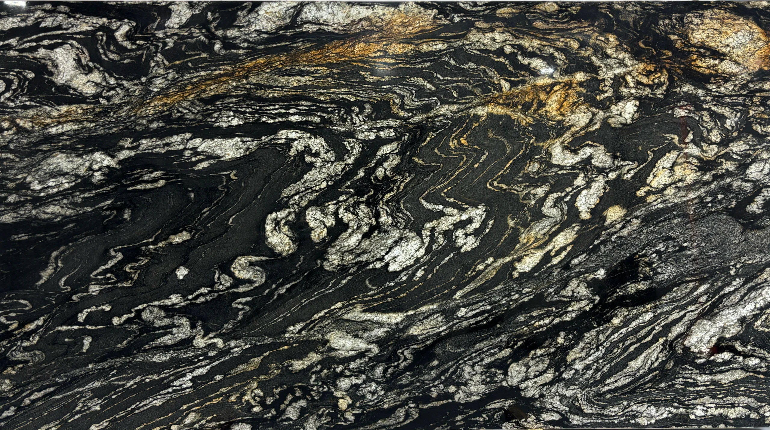 This granite features a deep black base with flowing ivory and gold mineral veining, creating bold movement and a striking, high-contrast look, perfect for statement countertops, islands, and dramatic focal spaces.